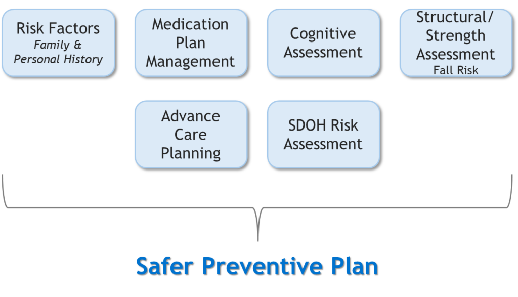 Unlike an illness-related visit, Medicare Wellness Visits focus on the total patient risks and associated prevention strategies. In the review of all medications, cognitive and structural strength, risk factors, and recommended preventive services in this visit, a safer plan for the next 5-10 years is developed and updated as the patient’s physical, social, or behavioral status changes. In developing that plan, utilization of expensive resources can be delayed or even prevented through ACPs in plan, inclusion of SDOH factors in the plan, and prescribing or de-prescribing of high-risk medications when indicated. The graphic below shows how this would work with an Annual Wellness Visit: