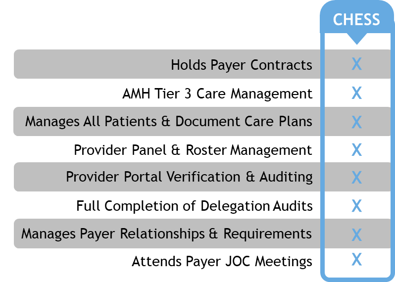 CHESS offers comprehensive services for providers who want to delegate care management for their Medicaid patient populations. We act as an extension of your care team to ensure high-quality, coordinated care delivery.