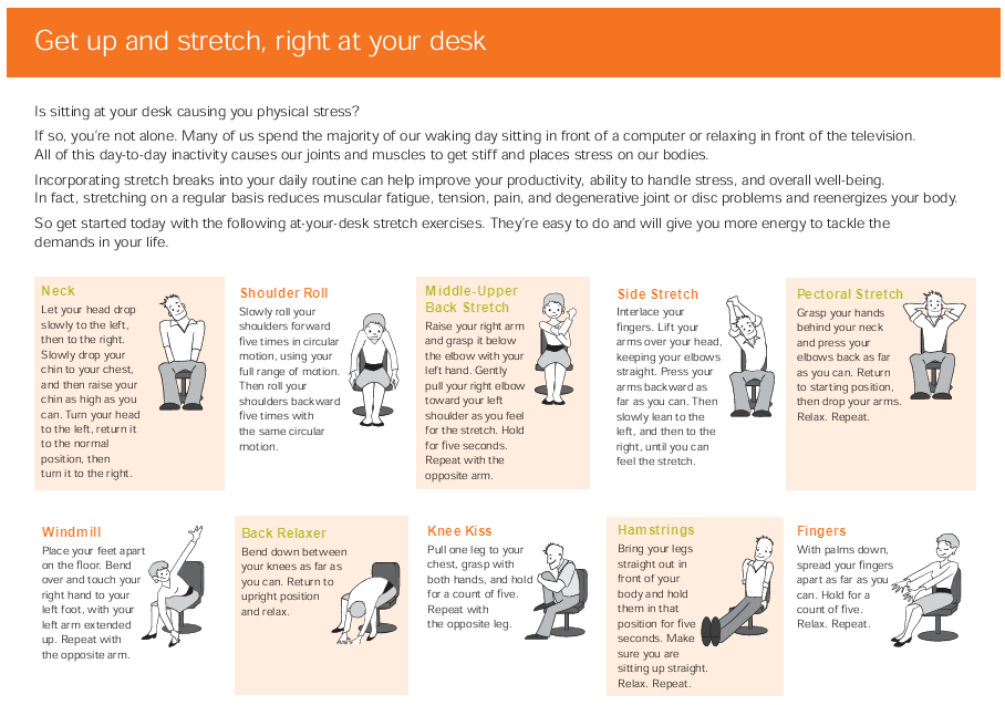 Stretching at your desk is a simple yet effective way to relax and rejuvenate during a busy workday. Taking a few minutes to stretch can alleviate muscle tension, improve circulation, and reduce stress. Gentle stretches for the neck, shoulders, back, and legs can help relieve stiffness and prevent discomfort associated with prolonged sitting. Incorporating desk stretches into your daily routine promotes physical and mental relaxation, boosts energy levels, and enhances focus. It’s an easy way to care for your body and mind, helping you feel more relaxed and productive throughout the day. DOWNLOAD PDF OF STRETCHES HERE